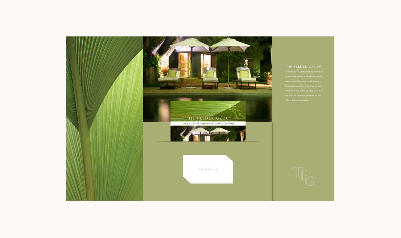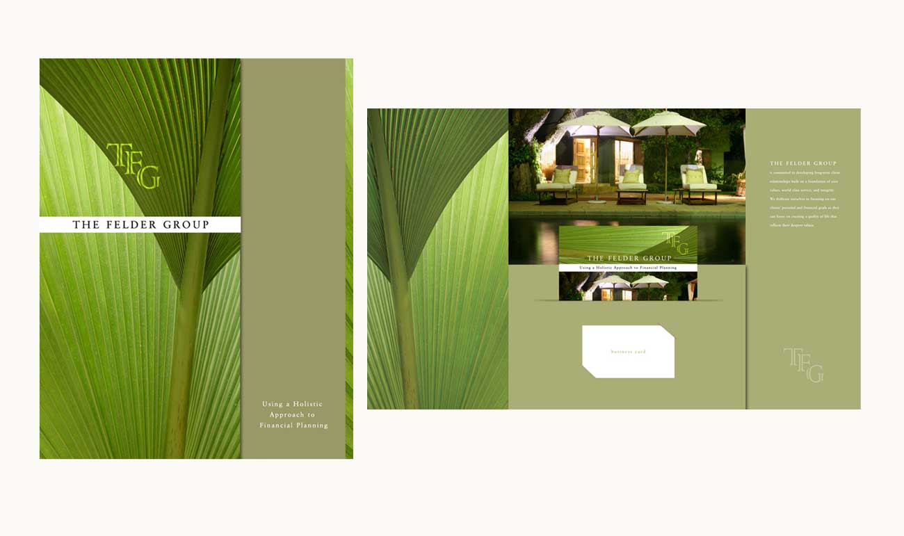 The Felder Group is a financial advisory firm whose target clientele are professional single women. The Group hired us to create a custom folder and brochure that feature a luxury, spa-like look and feel, reflecting high-end customer service and the quality lifestyle the Felder Group helps its clients achieve.